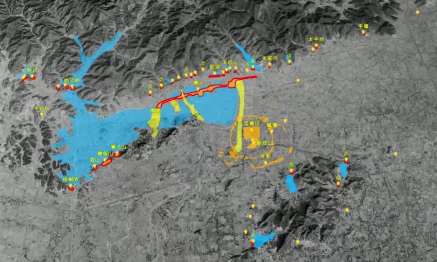 依据此办法,近年来新发现20余条良渚水坝(图中黄色点位所示),基本揭示良渚古城遗址外围水利系统完整结构。