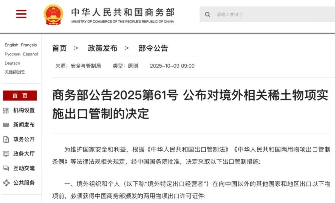 10月9日上午,商务部发布两则公告,对含有中国成分的部分境外相关稀土物项、稀土相关技术实施出口管制;